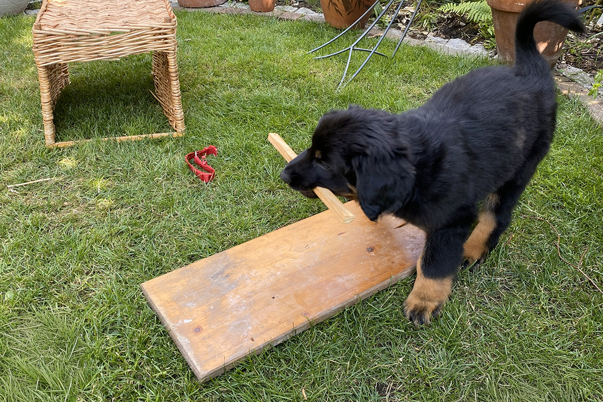 Temperamentvoll, souverän und selbstbewusst setzte sie schon im Welpenalter sehr schnell ihre Grenzen und ging oft auch eigensinnig ihren Weg. Jeder Schuh, wenn nicht ordentlich weggeräumt, jeder Korb, der unschuldig rumstand, fand sehr schnell das Interesse ihrer kleinen Zähne. Auch liebte sie Blumen und Pflanzenbeete im Garten und versteckte sich zu gerne in diesen. Noch heute sehe ich oft ihr Bild – als sie schon etwas Gehorsam kennend – freudig unserem Ruf folgend – konsequent im Vorbeispringen die letzte oder größte Blüte noch schnell abbiss.