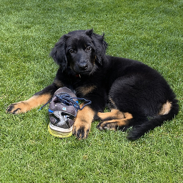 Temperamentvoll, souverän und selbstbewusst setzte sie schon im Welpenalter sehr schnell ihre Grenzen und ging oft auch eigensinnig ihren Weg. Jeder Schuh, wenn nicht ordentlich weggeräumt, jeder Korb, der unschuldig rumstand, fand sehr schnell das Interesse ihrer kleinen Zähne. Auch liebte sie Blumen und Pflanzenbeete im Garten und versteckte sich zu gerne in diesen. Noch heute sehe ich oft ihr Bild – als sie schon etwas Gehorsam kennend – freudig unserem Ruf folgend – konsequent im Vorbeispringen die letzte oder größte Blüte noch schnell abbiss.